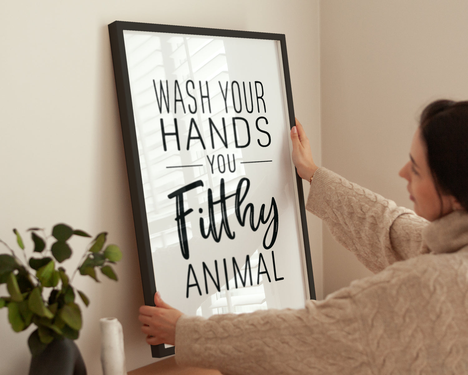 Dieses Poster kombiniert modernen Typografie-Stil mit einem frechen Spruch: „Wash Your Hands You Filthy Animal“. Perfekt, um im Badezimmer oder Gäste-WC humorvolle Akzente zu setzen und deine Gäste zum Schmunzeln zu bringen. Ideal auch als Geschenk.
