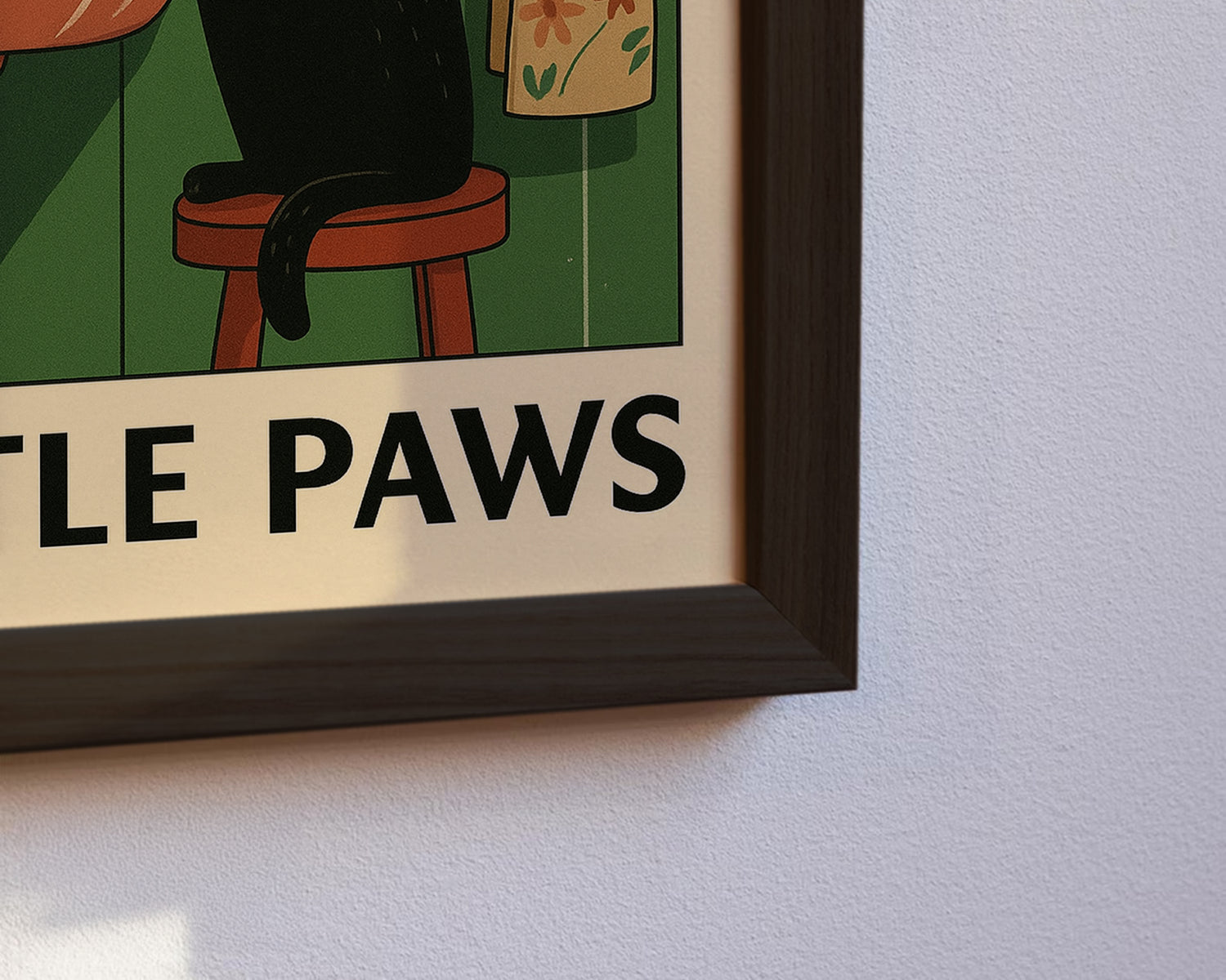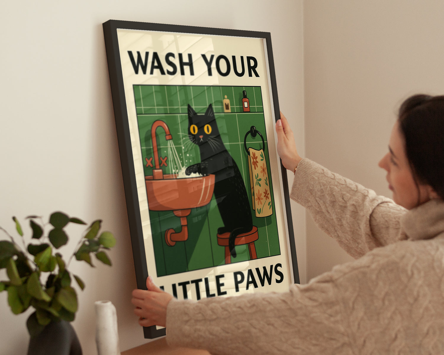 Dieses liebevoll gestaltete Poster zeigt eine schwarze Katze mit leuchtenden gelben Augen, die ihre Pfoten im Waschbecken wäscht. Umgeben von grünen Retro-Fliesen, Seifenspendern und einem Handtuch verbreitet das Motiv einen charmanten Vintage-Flair. Die witzige Botschaft „Wash Your Little Paws“ macht es zu einer idealen Wanddekoration, besonders für Badezimmer, Gäste-WCs oder Katzenfreunde, die humorvolle Akzente in ihrem Zuhause setzen möchten.