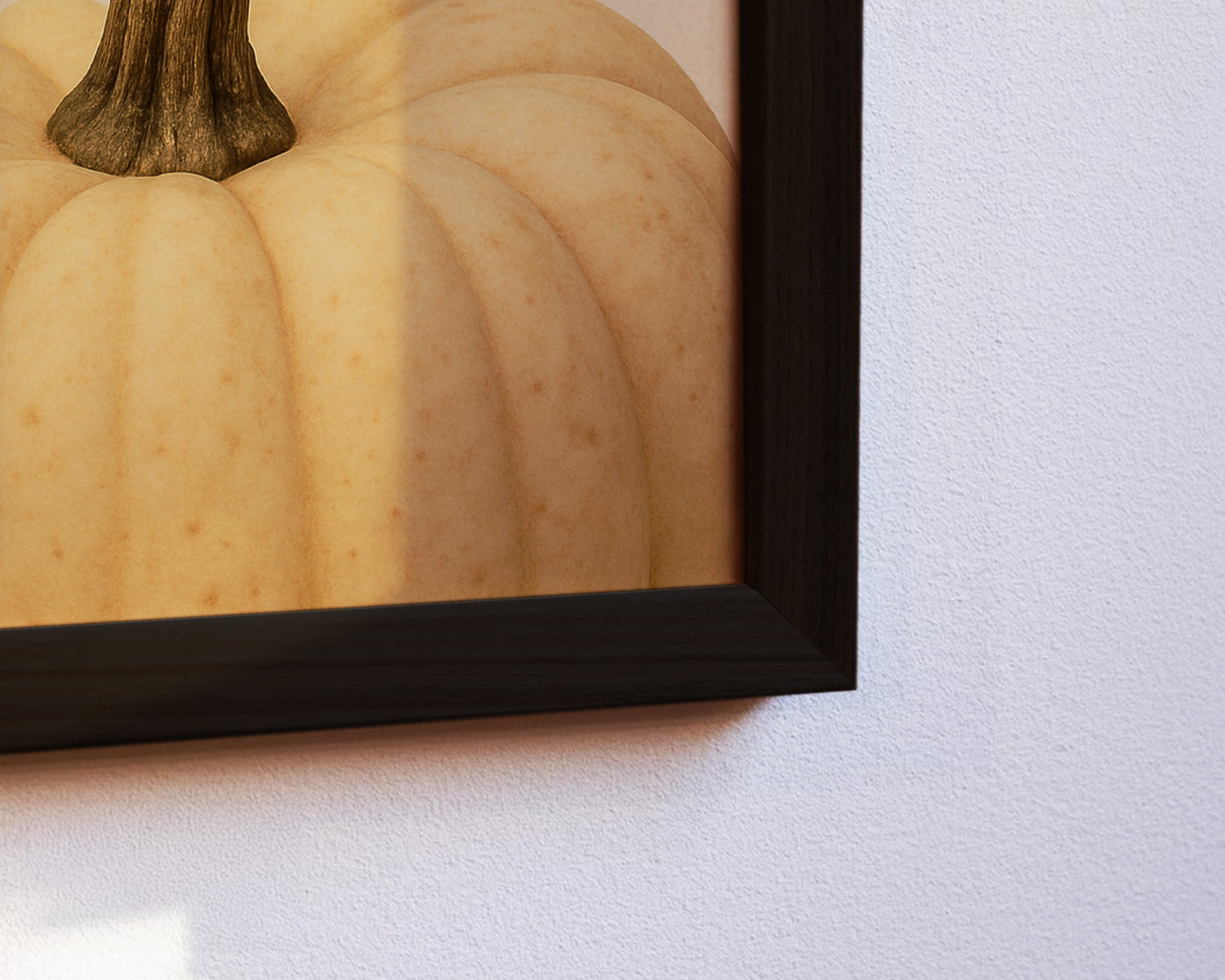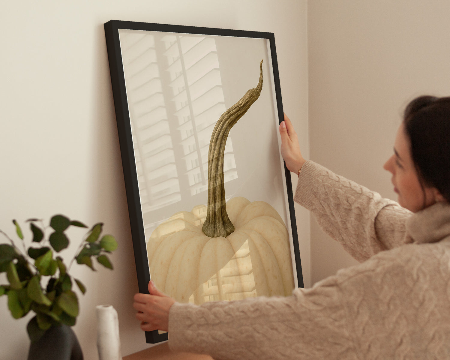 Minimalistisches Poster mit einem weißen Kürbis vor hellem Hintergrund. Die natürliche Struktur und der geschwungene Stiel verleihen dem Motiv eine elegante Schlichtheit, die sich perfekt mit anderen Herbstpostern kombinieren lässt.