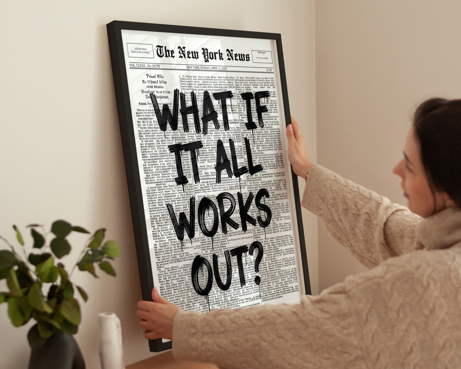 Zeitungs-Poster in Schwarz-Weiß mit handgeschriebenem Graffiti-Slogan What If It All Works Out?. Ein inspirierendes Wandbild im urbanen Street-Art-Stil. Perfekt für Wohnzimmer, Homeoffice oder moderne Galeriewände.
