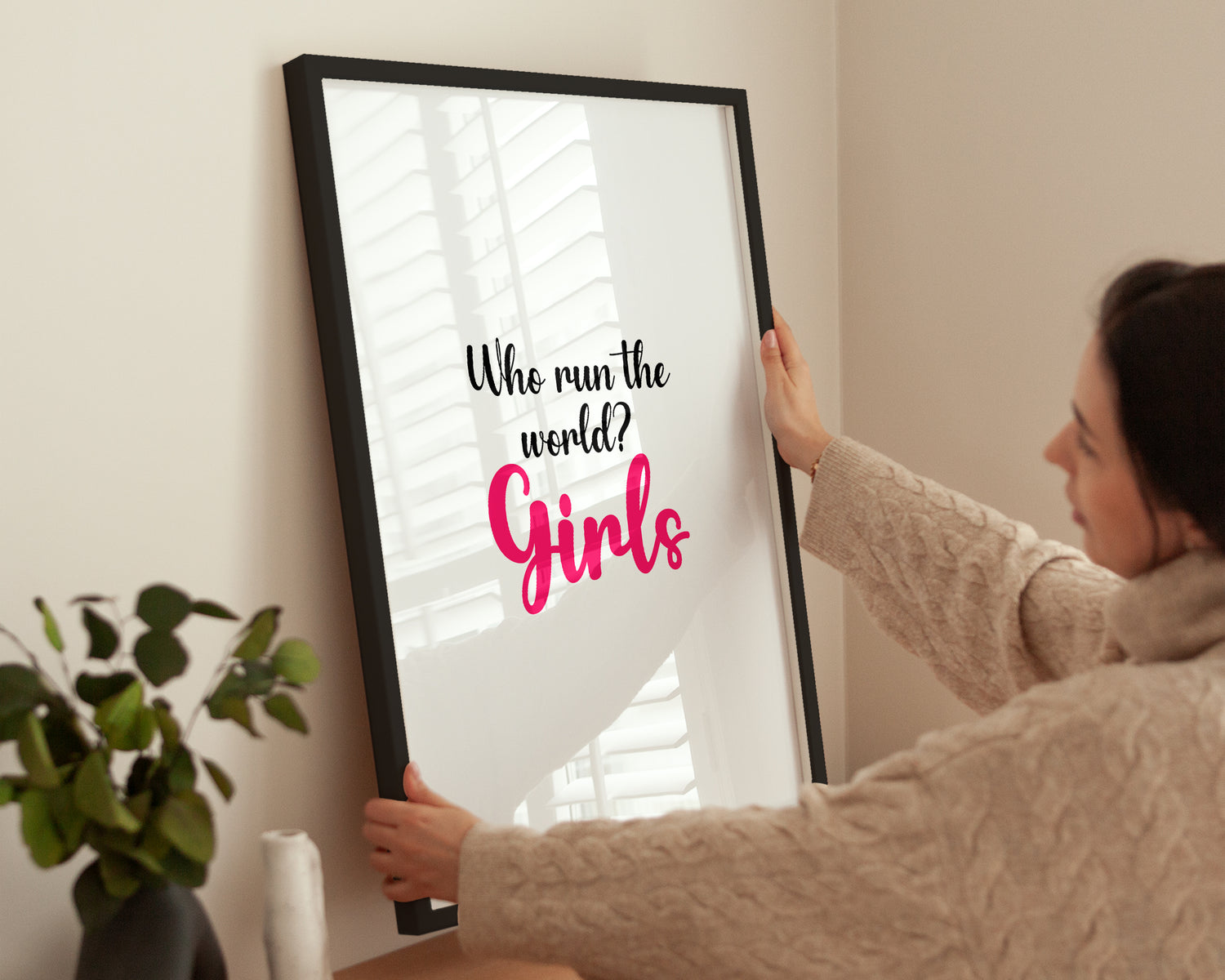 Dieses moderne Wandbild zeigt den bekannten Spruch Who run the world Girls in einer stilvollen Kombination aus schwarzer und pinker Schrift auf weißem Hintergrund. Das minimalistische, aber kraftvolle Design setzt ein klares Statement für Selbstbewusstsein und Female Empowerment. Ob im Büro, Wohnzimmer oder Schlafzimmer – dieses Poster sorgt für Motivation und ein feminines Flair. Perfekt geeignet, um deine Persönlichkeit und Stärke dekorativ in Szene zu setzen.