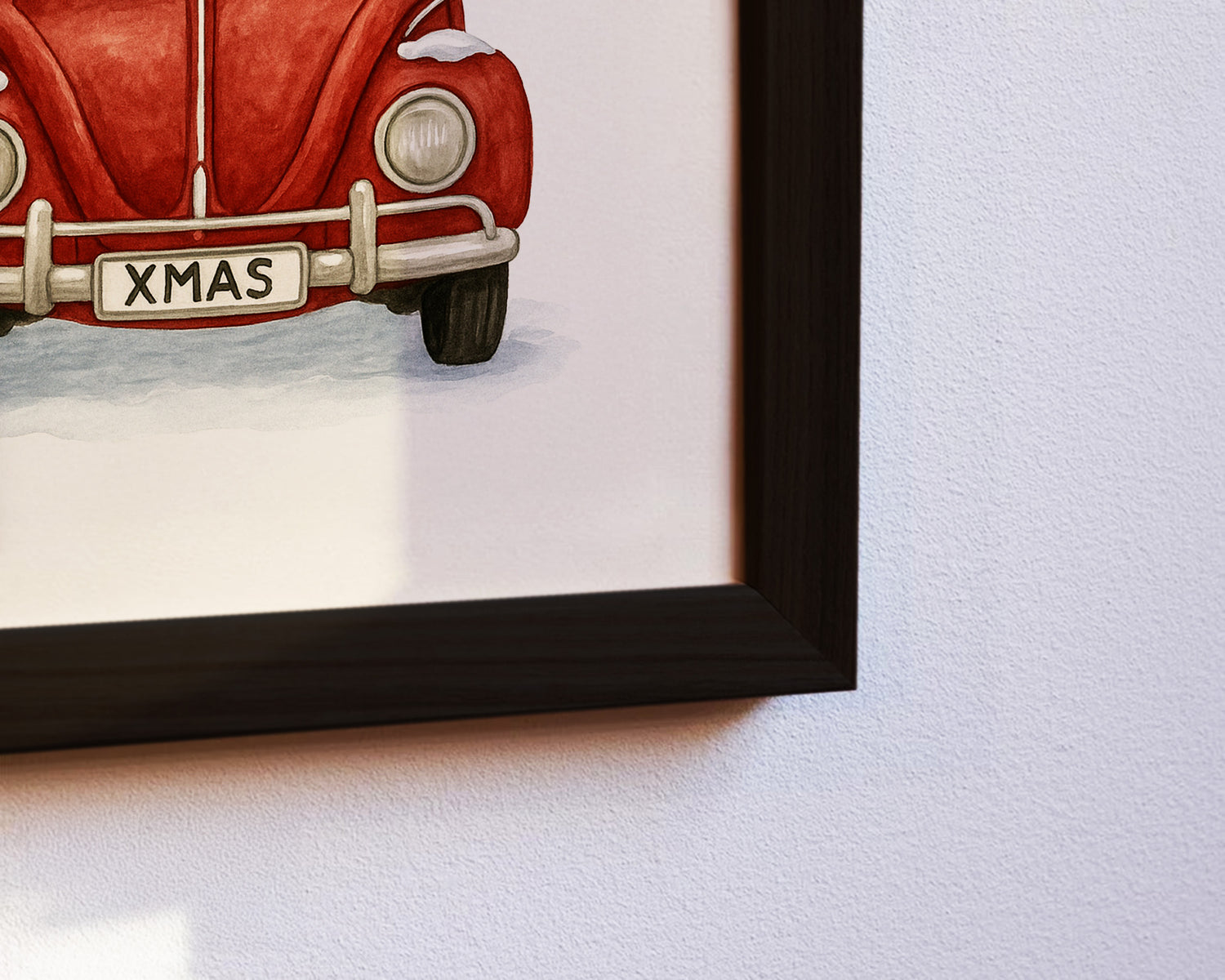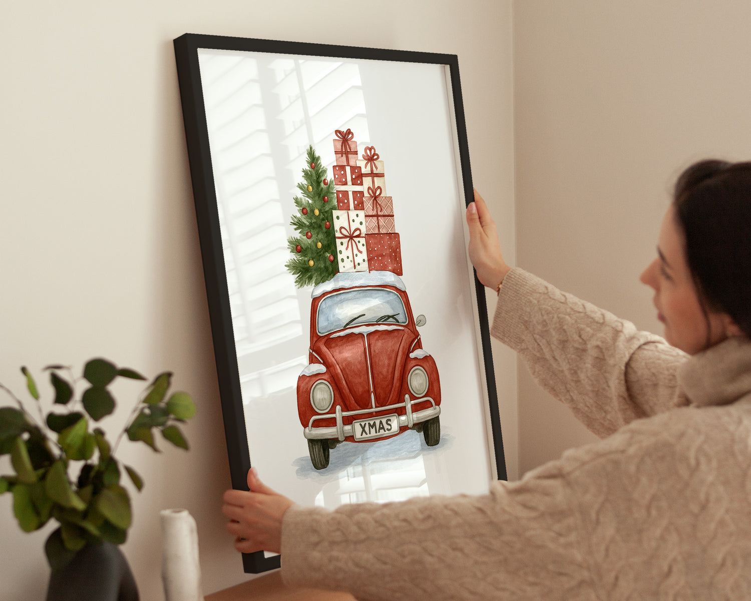 Verspieltes Poster mit einem roten Käfer, der einen Weihnachtsbaum und zahlreiche Geschenke auf dem Dach trägt. Die Illustration kombiniert weihnachtliche Freude mit Retro-Charme. Ein Hingucker für die Advents- und Weihnachtszeit.