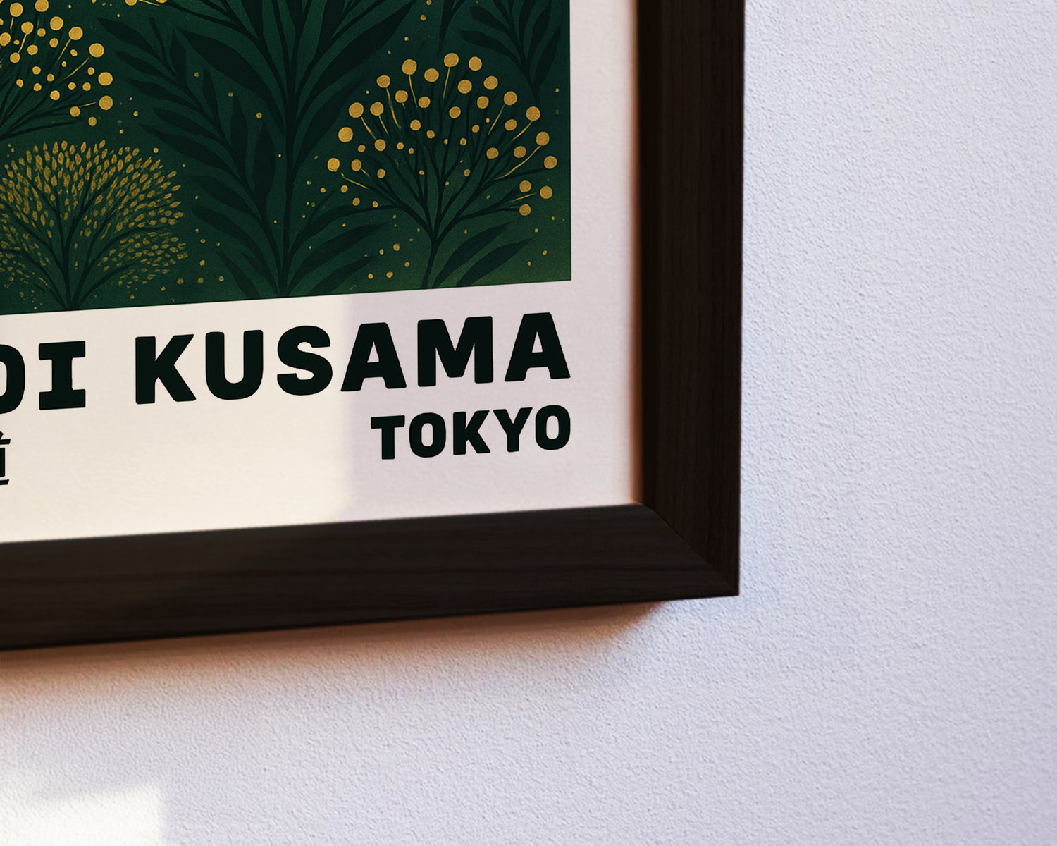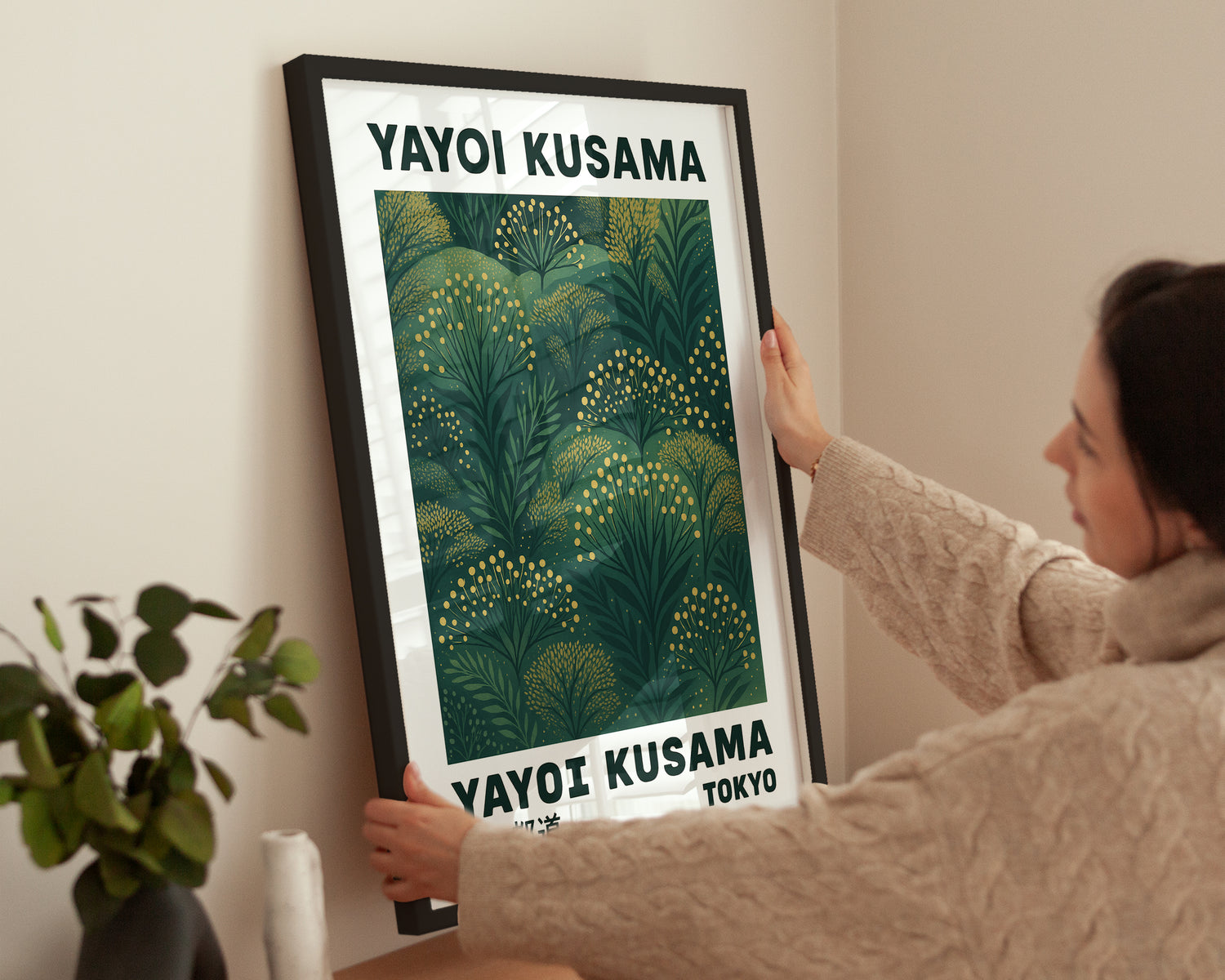 Dieses stilvolle Poster ist inspiriert von der weltberühmten japanischen Künstlerin Yayoi Kusama. Es zeigt ein faszinierendes Muster in satten Grüntönen, das spielerisch mit Punkten und Linien arbeitet und so eine moderne, minimalistische Atmosphäre schafft. Perfekt geeignet als Wanddekoration für Wohnzimmer, Büro oder Flur, bringt dieses Kunstwerk fernöstliche Eleganz in dein Zuhause. Die grüne Farbpalette wirkt beruhigend und frisch zugleich und lässt sich wunderbar mit Naturholz, Weiß oder Schwarz kombinieren. Ideal für alle, die zeitgenössische Kunst lieben und einen Hauch japanischen Avantgarde-Stils in ihre Räume holen möchten.