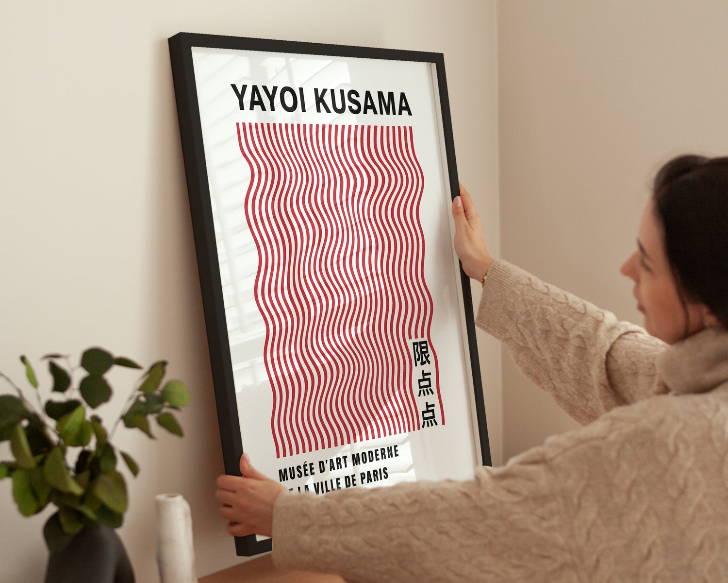 Dieses Poster zeigt ein abstraktes Kunstwerk von Yayoi Kusama mit dynamischen, roten Wellenlinien auf weißem Hintergrund. Die fließenden Formen schaffen eine hypnotische, fast organische Bewegung, die den Blick einfängt und den Raum belebt. Das Kunstwerk verbindet traditionelle japanische Ästhetik mit moderner Ausdruckskraft und eignet sich perfekt als auffälliger Akzent in Wohnzimmer, Schlafzimmer oder Büro. Die intensiven roten Linien setzen spannende Kontraste und machen das Poster zu einem echten Highlight an jeder Wand – ideal für alle, die zeitgenössische Kunst und minimalistisches Design lieben.