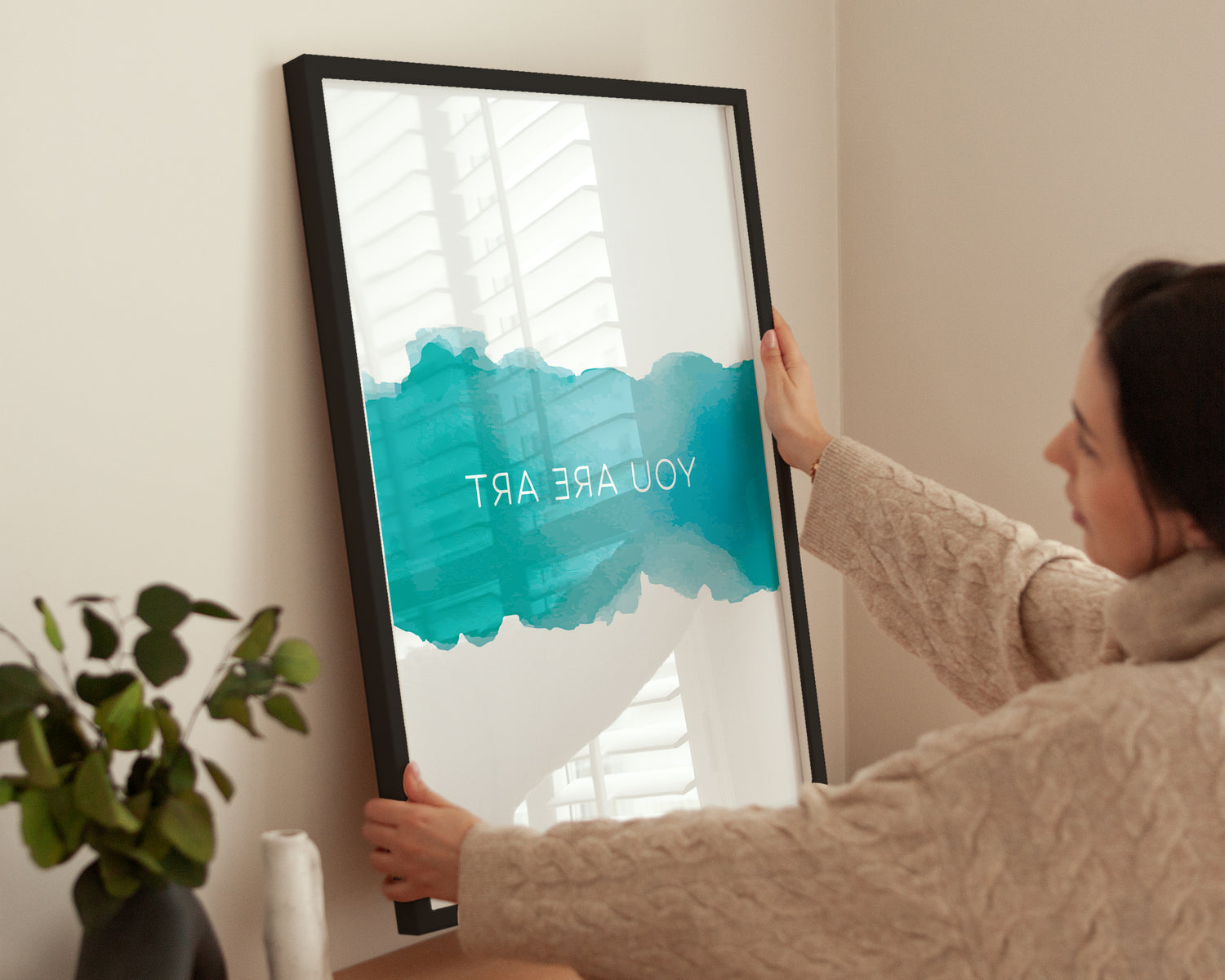 Dieses moderne Typografie Poster zeigt den motivierenden Spruch „You Are Art“ in weißer Schrift auf einem lebendigen Aquarell-Hintergrund in verschiedenen Blautönen. Das Design verbindet Leichtigkeit und künstlerischen Ausdruck und eignet sich ideal, um Wohnzimmer, Schlafzimmer, Büro oder Atelier zu verschönern. Es inspiriert zu mehr Selbstwert und Kreativität und setzt dabei ein stilvolles Statement an jeder Wand.