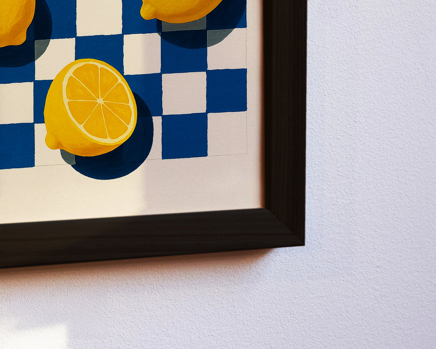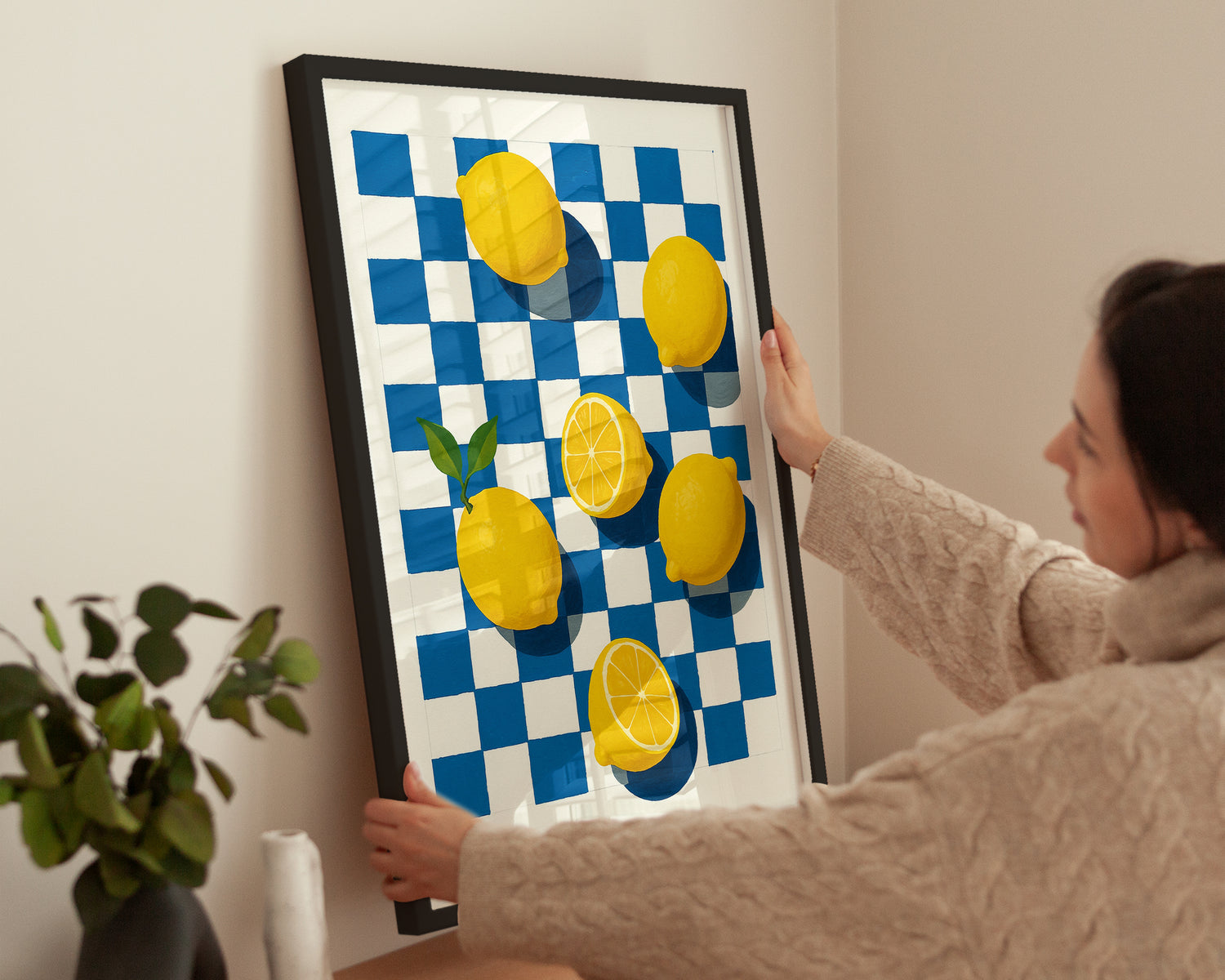 Dieses lebendige Poster zeigt fünf gelbe Zitronen, teils aufgeschnitten, auf einem markanten blau-weißen Schachbrettmuster. Die mediterrane Farbwelt bringt Frische und gute Laune in Küche, Esszimmer oder Café. Perfekt für alle, die sommerliche Akzente lieben.